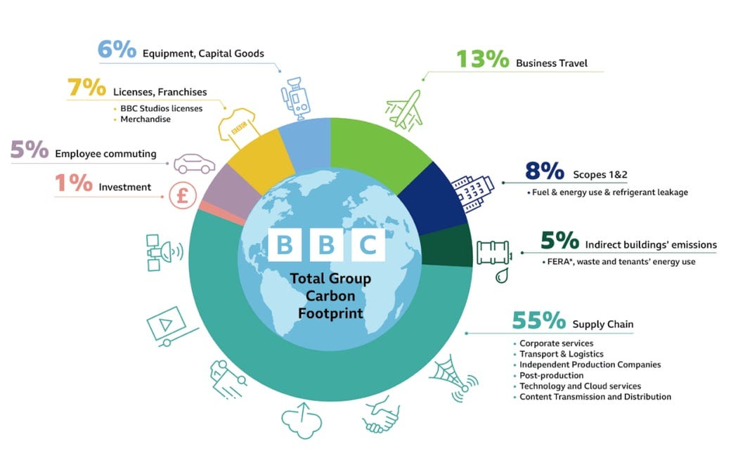 The BBCâs supply chain is its largest emissions contributor, accounting for 55% of the organisationâs carbon footprint. Every year, the BBC works with over 7,000 suppliers of varying sizes, with half of its supply chain emissions coming from its top 30 suppliers.